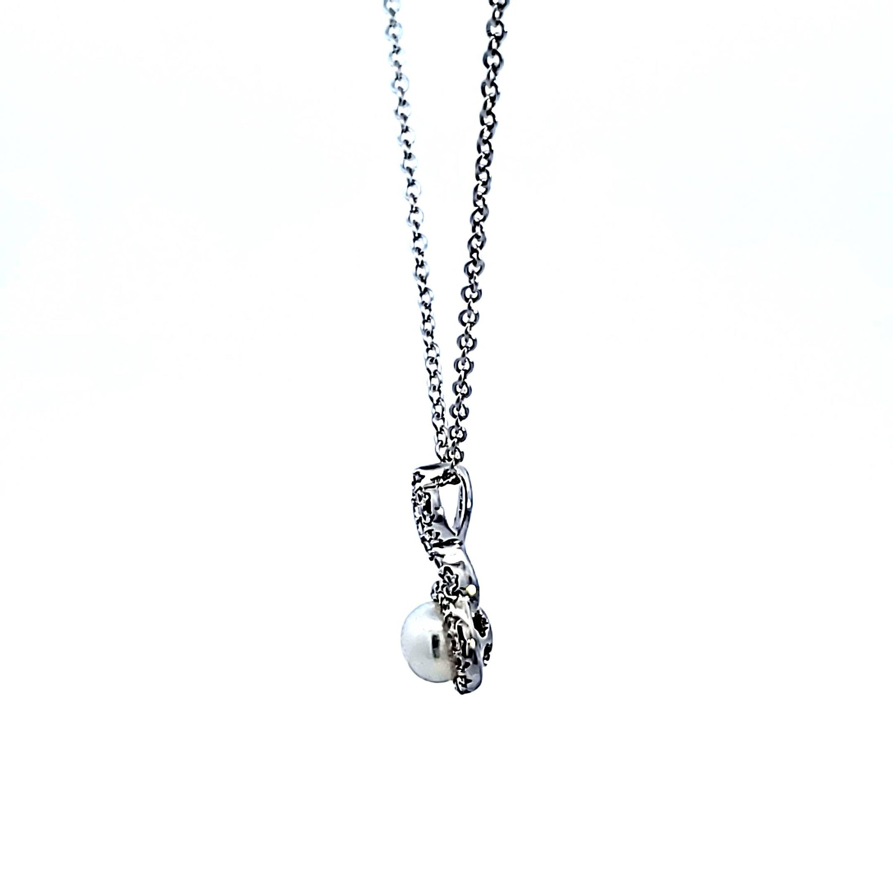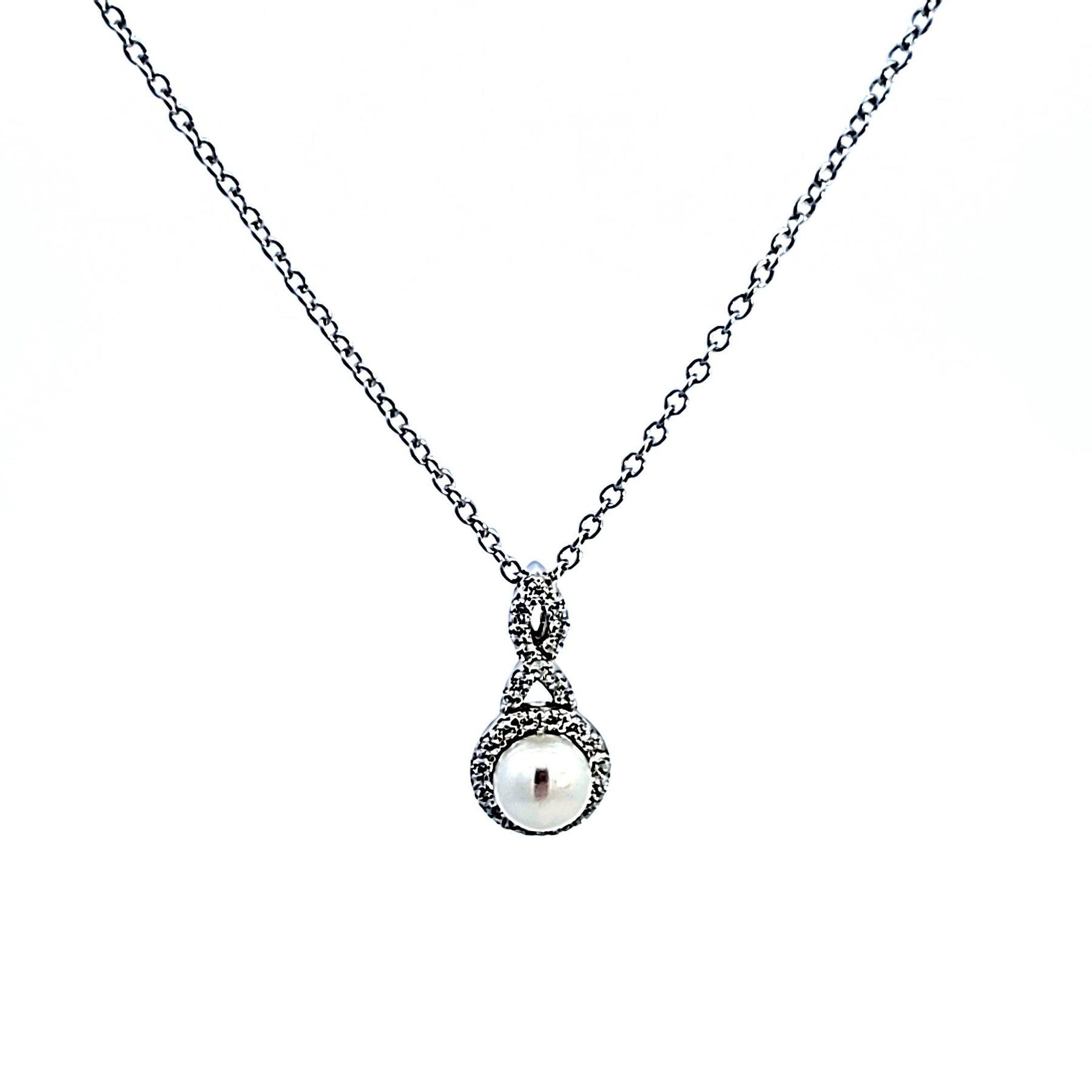 Discover timeless beauty with this stunning freshwater pearl and cubic zirconia pendant necklace. Crafted from platinum plated sterling silver, its gleaming pearl centerpiece with cubic zirconia accents complemented by an elegant silver chain, ideal for elevating both everyday outfits and special ensembles.